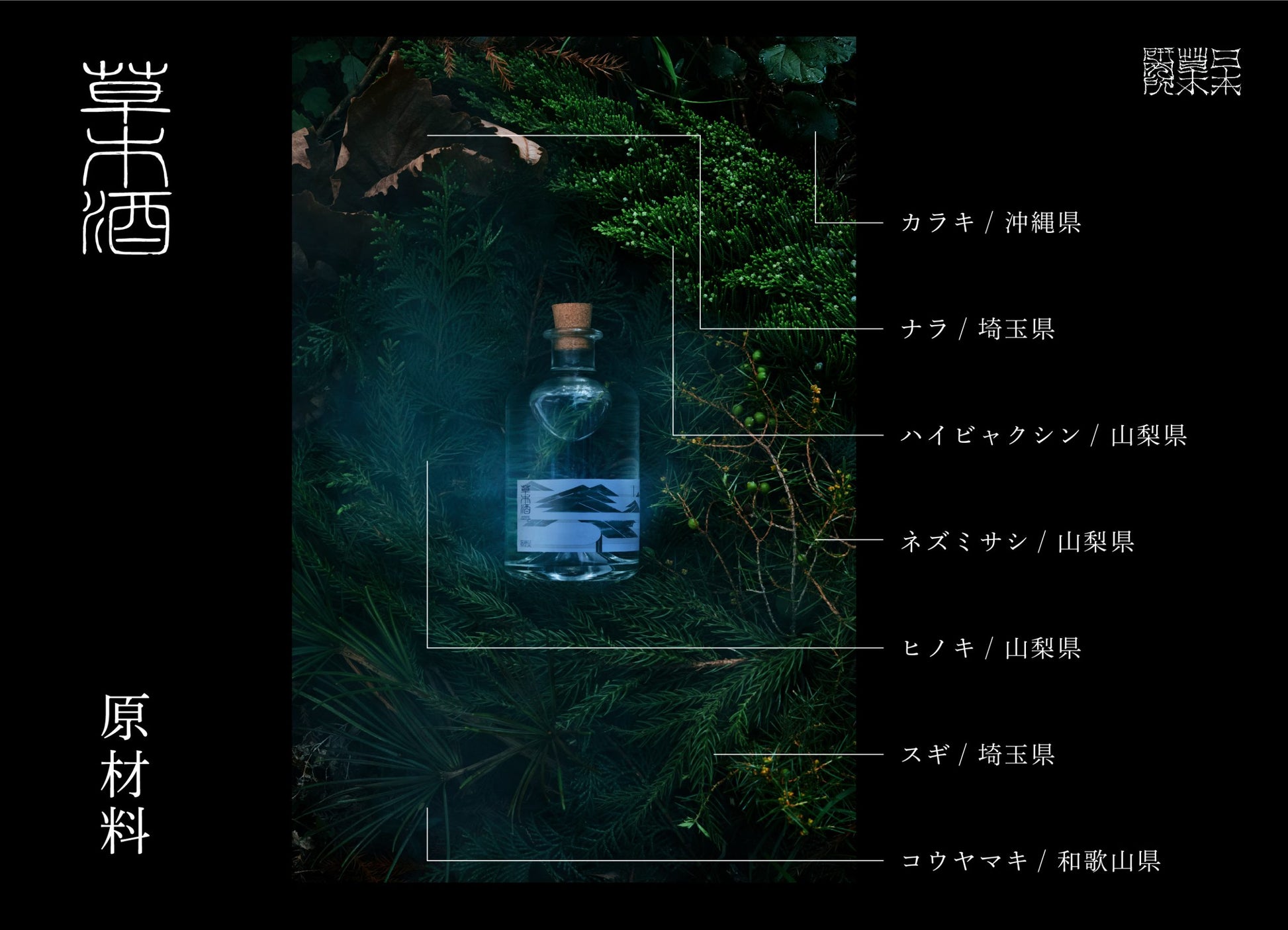 まるで深い新緑の森の中で深呼吸したときのような圧倒的な「森林感」を味わえるフォレストジン。ヒノキの枝葉から抽出する鼻を抜ける青いフレッシュな香りや、杉の林檎を思わせる穏やかな芳香、そして神事でも利用される高野山の霊木コウヤマキの酸味のある後味。ハイビャクシンとネズミサシは和製ジュニパーベリーとして機能し、スパイシーで華やかな風味が引き立ちます。
