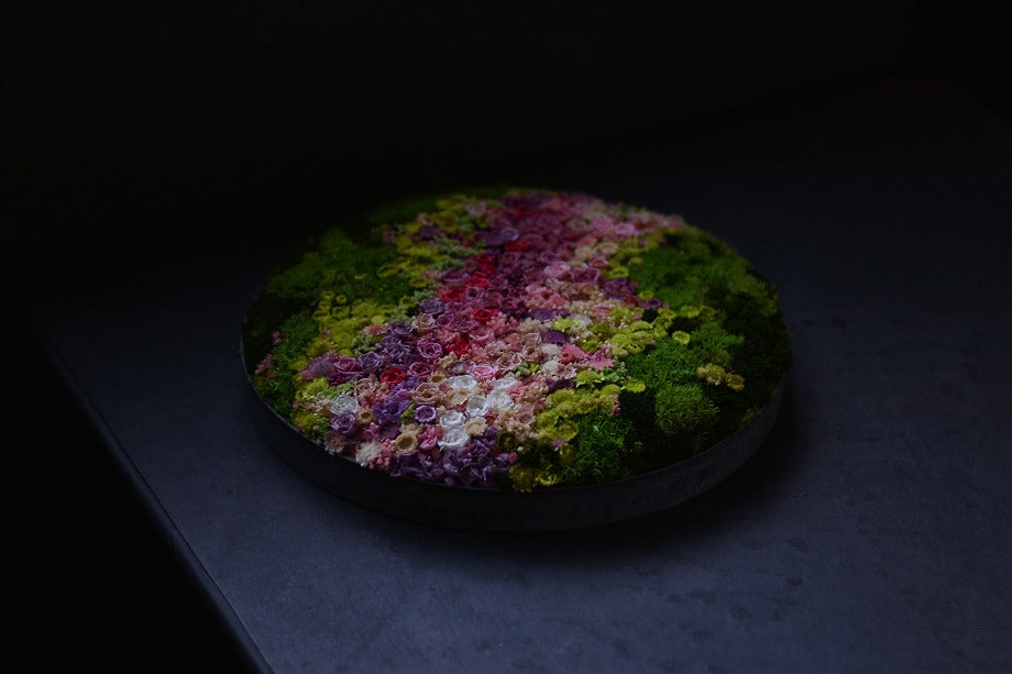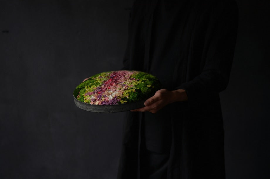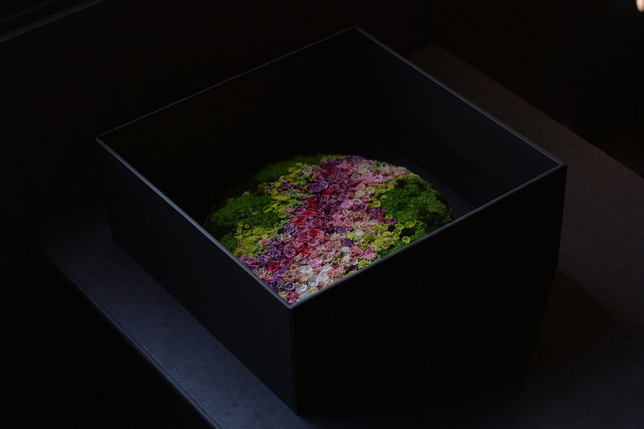 We have created an ideal landscape of meadows, flower fields, and mountains within a vessel that fits comfortably in both hands. Using preserved and dried flowers, we craft Hanayama inside a container with a diameter of approximately 33cm.