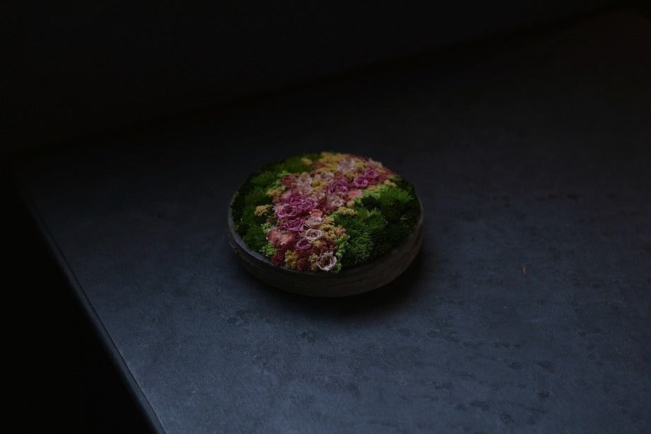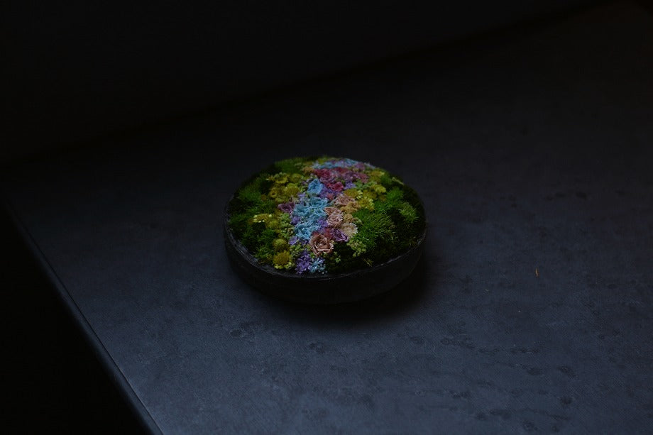 Create a natural landscape within the palm of your hands with this art piece. Inside an approximately 17cm diameter vessel, we've crafted ideal scenes such as meadows, flower fields, and mountains using preserved and dried flowers. Each Hanayama is made to order, tailored to your preferences, with a production period of approximately 2 weeks. You can enjoy this piece for about 1 to 3 years, as it's created using preserved and dried flowers, ensuring it stays beautiful for a longer time than fresh flowers.