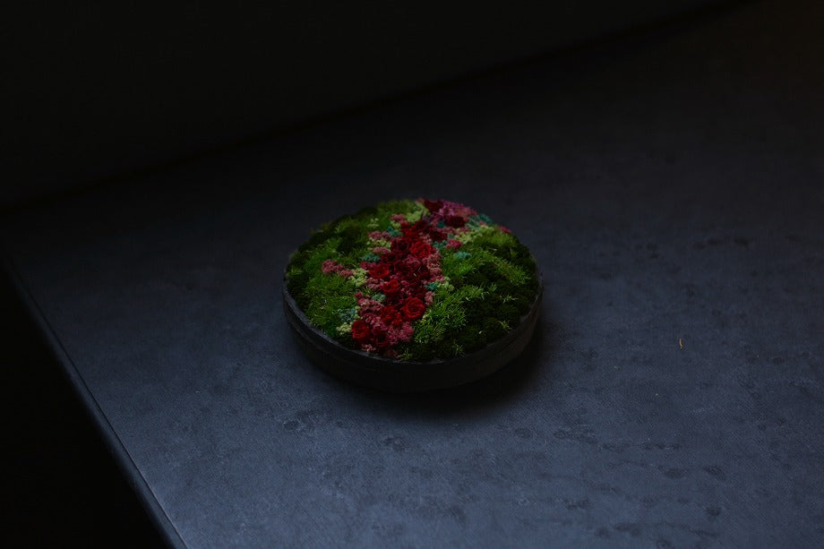 通过这件艺术品,在你的手掌中创造一个自然风景。在直径约17厘米的容器内,我们使用了保鲜花和干花,制作了草原、花田和山等场景。每个Hanayama都是根据订单制作的,根据您的喜好定制,制作周期约为2周。您可以欣赏这件作品约1到3年,因为它是使用保鲜花和干花制作的,保证比鲜花更长时间地保持美丽。