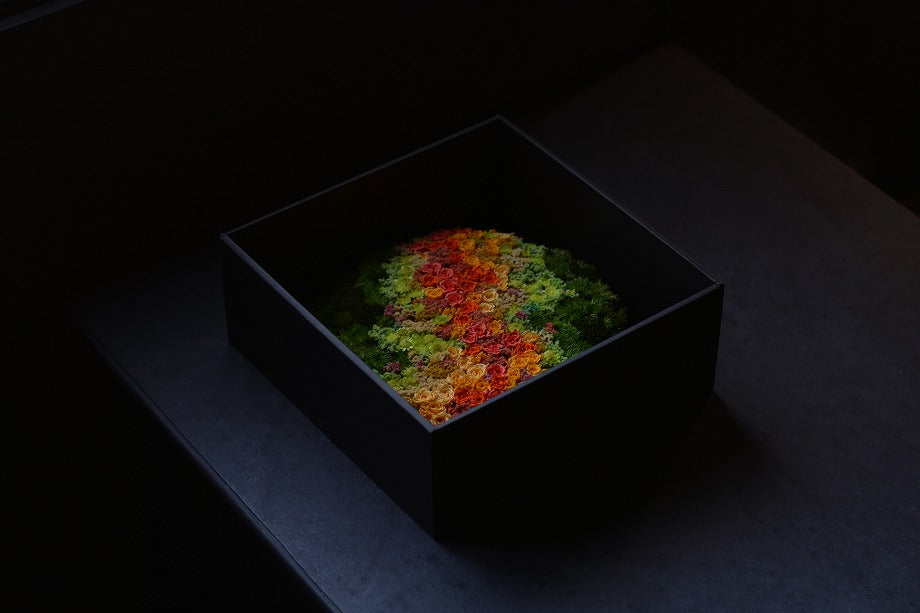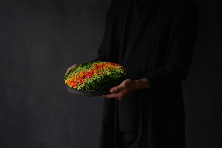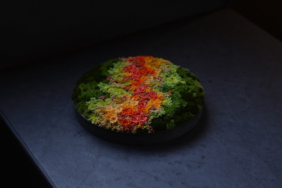 We have created an ideal landscape, such as a grassy field, a flower meadow, and mountains, inside a container that fits comfortably in both hands, measuring approximately 27cm in diameter, using preserved and dried flowers. We will craft this Hanayama according to your order, and the production period is approximately 2 weeks. You can enjoy it for about 1 to 3 years since it is made with preserved and dried flowers, which allows it to stay beautiful for a longer time compared to fresh flowers.