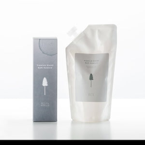 This luxurious bath essence features high-purity Hinoki (Japanese cypress) essential oil sourced from Nobeoka, Kyushu, known for its deeply soothing, woodsy aroma.