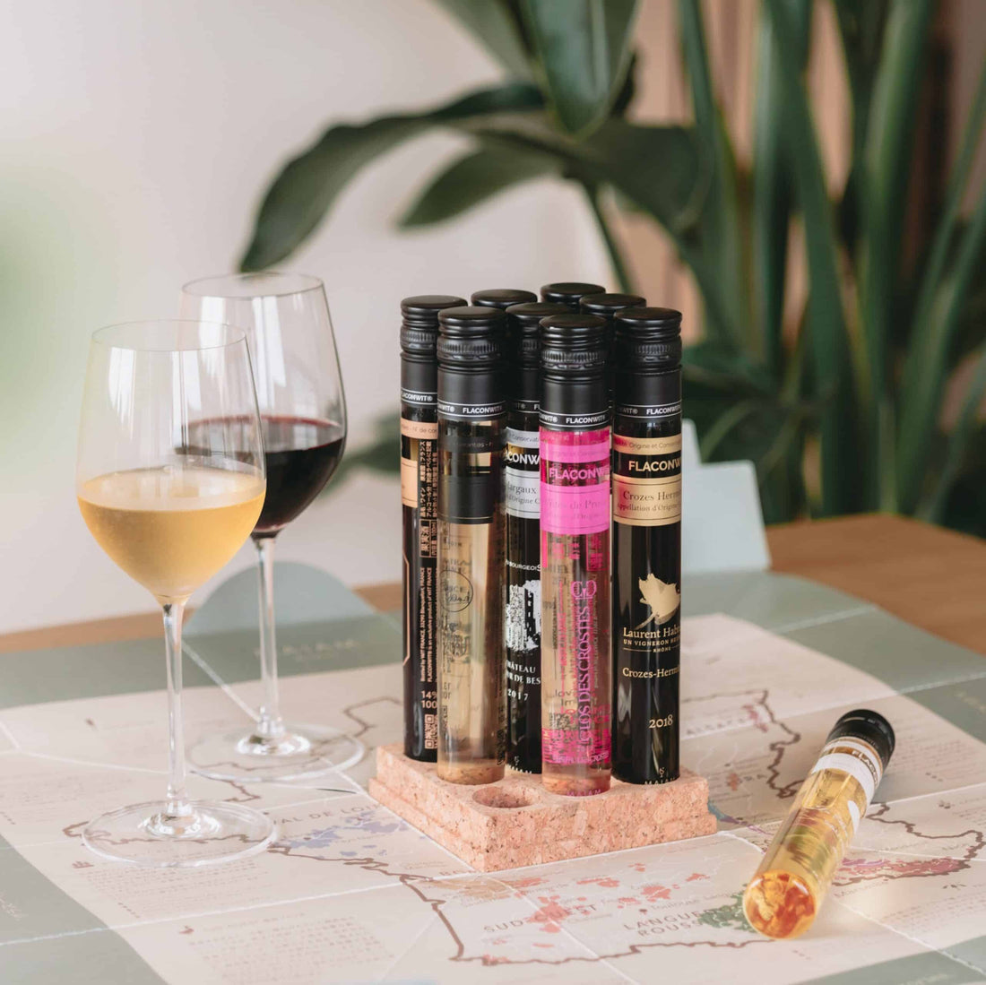 A luxurious set of 9 bottles designed for everyday enjoyment in various settings. When you open the box, you'll find an original map of France filled with information about the wines. The cork stand can also be used as a wine display. With the map in hand, you can enjoy a diverse selection of wines and feel like you're traveling through France. A glass of wine that enriches life.