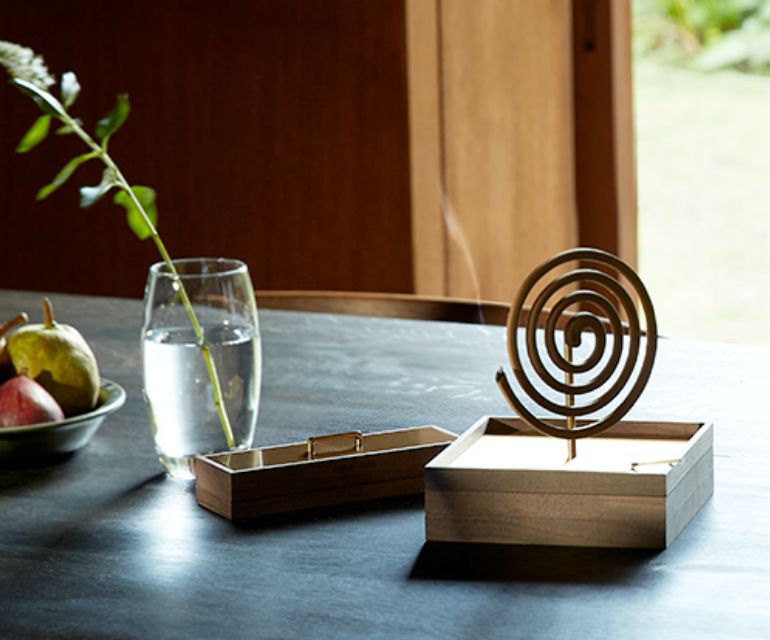 「お香立て」としてもお使いいただける「蚊取り線香立て」で、職人の技術と知恵を適材適所に落とし込んだ贅沢な逸品です。インテリアに溶け込む上品な佇まいは、唯一無二の存在感があり、夏の風物詩の一つである「蚊取り線香」が上質な空間を創るアクセントの一つへと生まれ変わります。