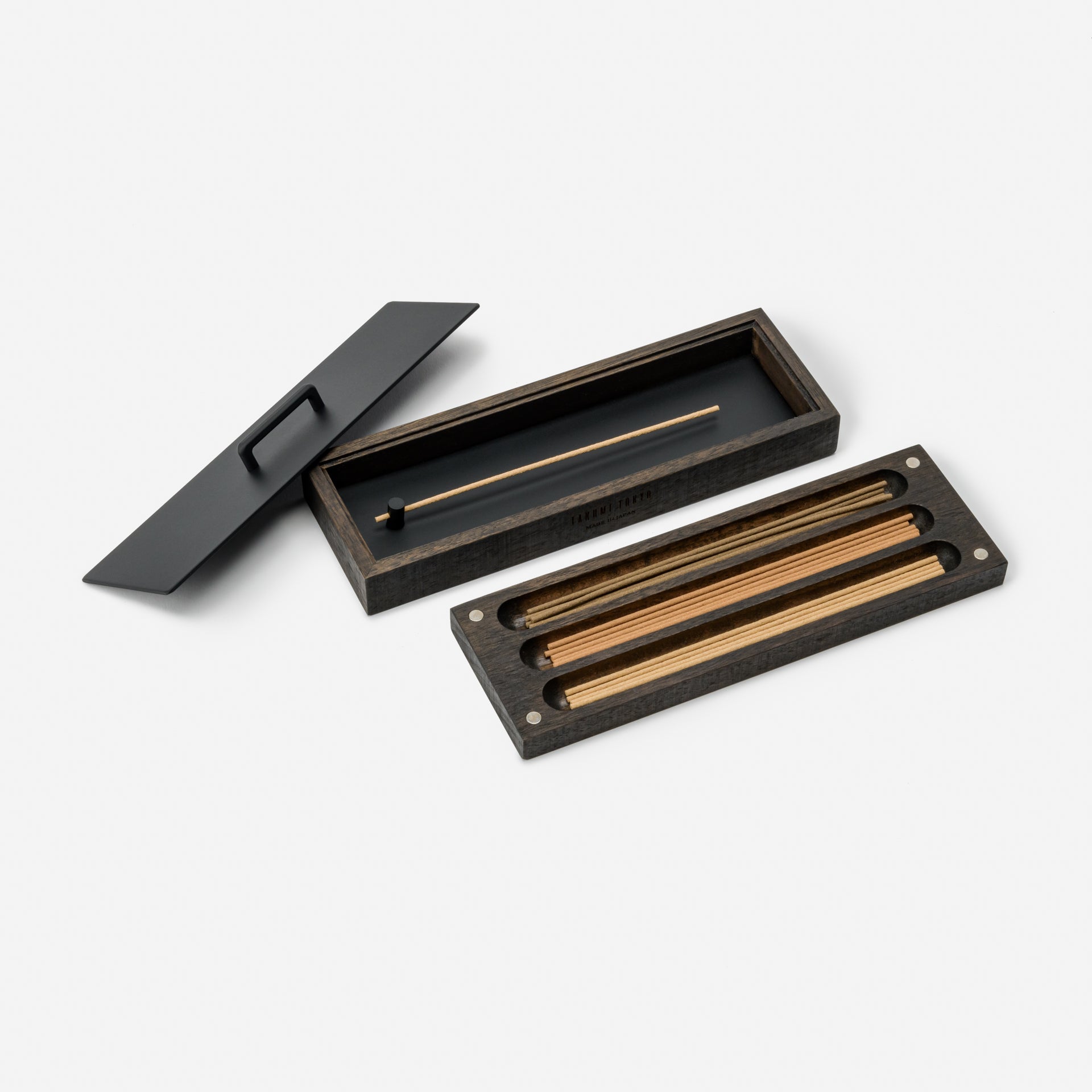 香りを楽しむお香立てで、香炉の約1/3のサイズなので持ち運びしやすく様々なシーンでご利用いただけます。2段目には3種類のお香が収納可能となっております。蓋もついているため、使用時以外は蓋を閉じておく事で灰が舞うのを防止でき、途中で火を消すことも可能です。真鍮に艶消しの黒塗装を施すことで、重厚感のあるアイアンのような仕上がりとなり、経年変化せず美しい状態のまま長くお使いいただけます。