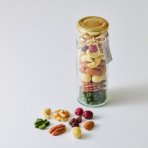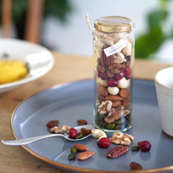 美容や健康におすすめな人気のナッツ6種類(ピーカンナッツ、ピスタチオスーパーグリーン、カシューナッツ、マカダミアナッツ、アーモンド、くるみ)と2種類のドライフルーツ(クランベリー、レーズン)をベジターレオリジナルの配合でおしゃれに瓶に詰め合わせました。