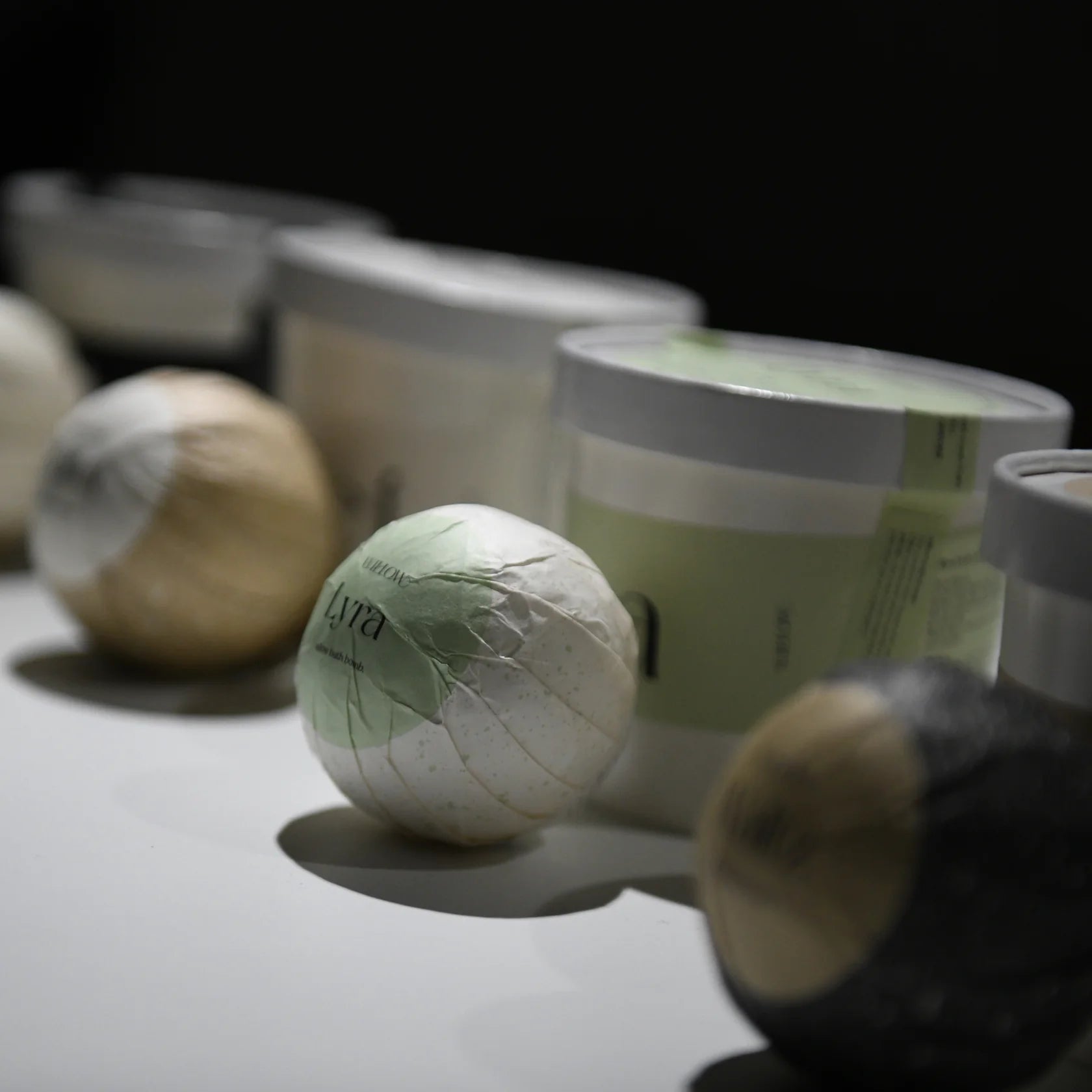 日本酒から生まれた成分αGGを配合したバスボム。お風呂上りのリラックスタイムに食べるアイスクリームを想像し、パッケージデザインに採用しました。